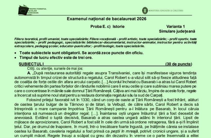 Subiecte Istorie, filiera teoretică, profil umanist și filiera vocațională – Simulare 2026, județul Gorj