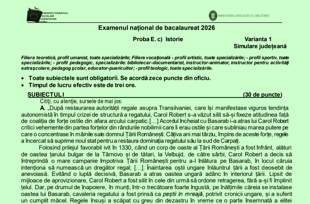Subiectele pe care le-au primit elevii de clasa a XII-a din Gorj la simularea județeană la Istorie au fost publicate de Inspectoratul Școlar Județean Gorj. Proba a fost susținută marți, 20 ianuarie, de copiii de la filiera teoretică, profil umanist și filiera vocațională, profilurile artistic, sportiv, pedagogic și teologic.