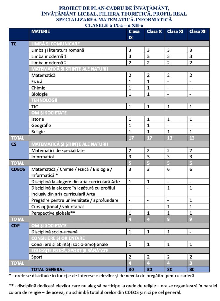 Plan-cadru pentru mate-info și științe ale naturii (clasele a IX-a și a X-a):