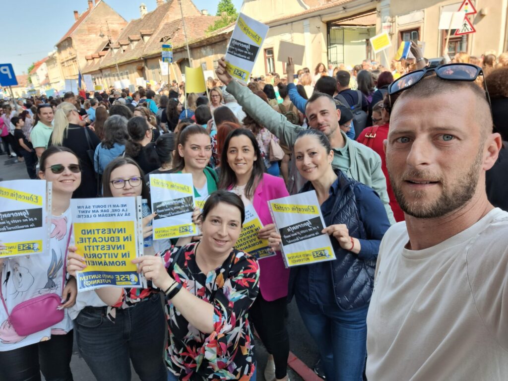 Sute de profesori protestează la Sibiu, în fața prefecturii, după ce președintele Iohannis i-a sfidat și soția sa a catalogat mitingul de la București drept eveniment politic. Ieri, Klaus Iohannis, aflat în vizită la Colegiul Brukenthal din Sibiu le-a spus unor elevi, după ce a făcut o poză oficială cu ei: “Vedeți, până și greva are ceva avantaje”.