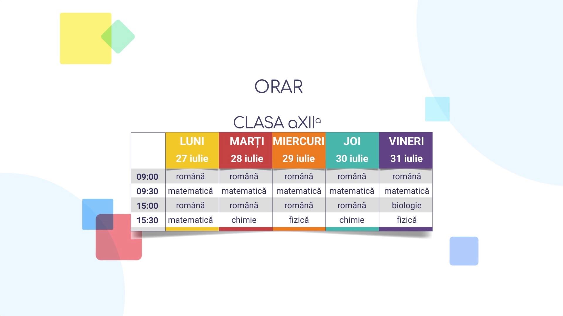 Orarul cursurilor pentru săptămâna 27-31 iulie arată că vpr fi câte 4 lecții pe zi. Fiecare disciplină are rezervate câte 30 de minute, iar orele vor fi difuzate atât dimineață, de la 9 și de la 9:30 (în acest interval orar erau orele pentru clasa a VIII-a în sezonul 1 al Teleșcoala), cât și de la ora 15 și 15:30. Săptămâna viitoare sunt ore de română, matematică, biologie, chimie și fizică.