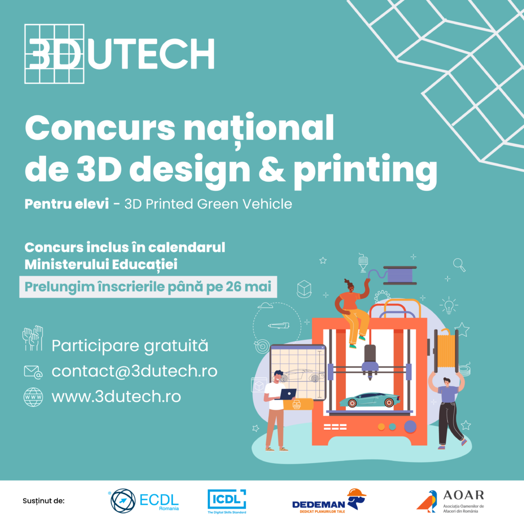 Regulamentul concursului destinat elevilor poate fi consultat pe www.3dutech.ro. Modificare și actualizare termene detaliate în Actul Adițional.