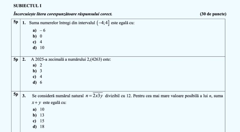 Inspectoratul Școlar Județean Sibiu a publicat modelul de subiect la Matematică pentru Evaluarea Națională 2025 propus elevilor spre rezolvare în luna ianuarie și baremul de evaluare și notare.