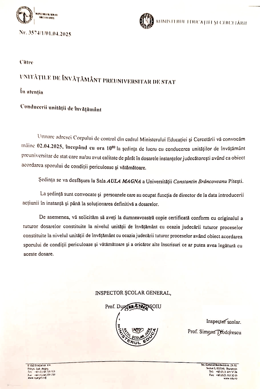 „Urmare adresei Corpului de control din cadrul Ministerului Educației și Cercetării vă convocăm mâine, 02.04.2025, începând cu ora 10:00, la ședința de lucru cu conducerea unităților de învăţământ preuniversitar de stat care au/au avut calitate de pârât în dosarele instanțelor judecătorești având ca obiect acordarea sporului de condiții periculoase și vătămătoare”, se arată în adresa ISJ Argeș.