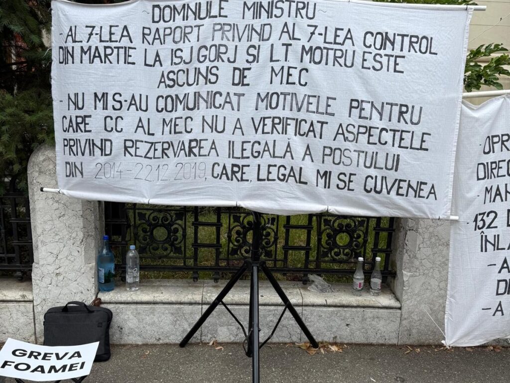 Profesorii Corina Pandru, Ramona Nibu, Valeriu Drulă și Camelia Bălănescu protestează în greva foamei în fața Ministerului Educației, acuzând instituția că, deși a recunoscut oficial toate abuzurile semnalate la Liceul Tehnologic Motru și în cadrul ISJ Gorj, refuză să aplice sancțiunile și măsurile dispuse prin propriul raport, potrivit mesajelor transmise de aceștia Edupedu.ro.