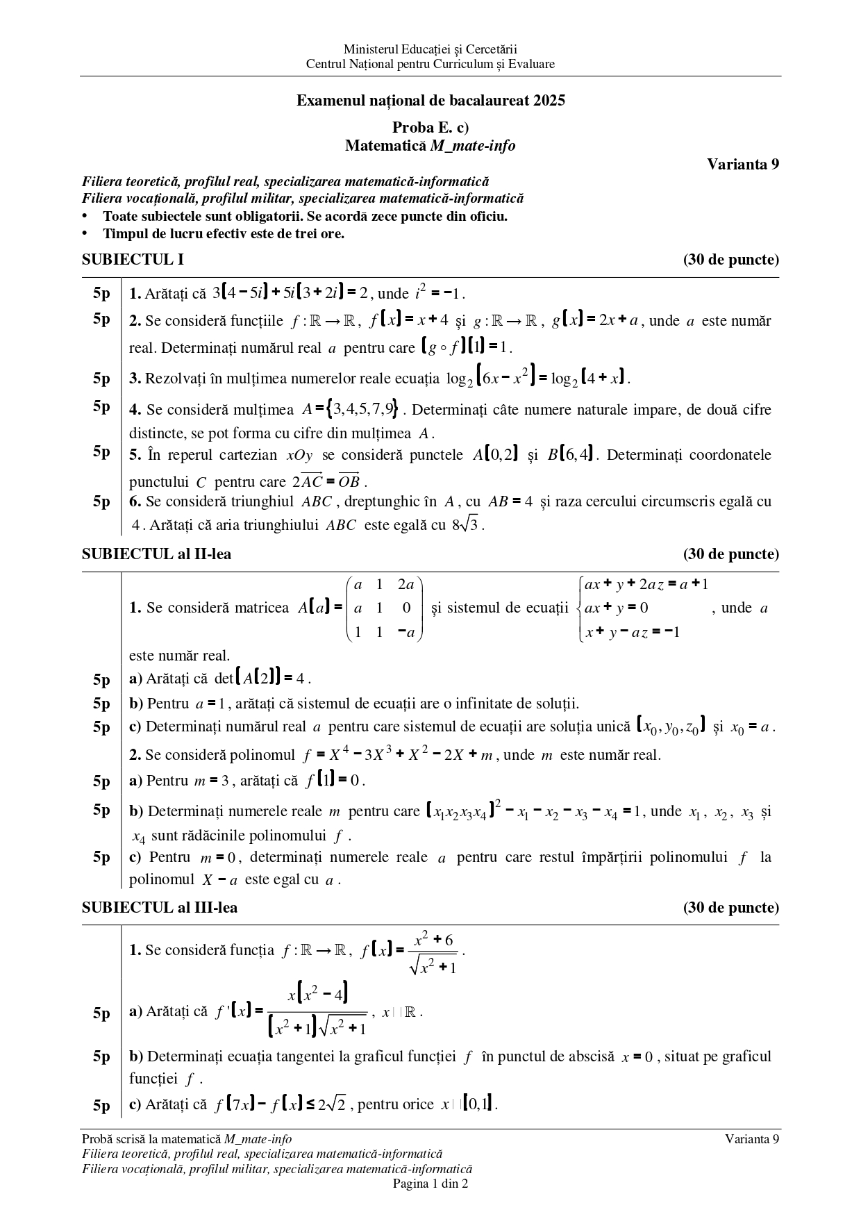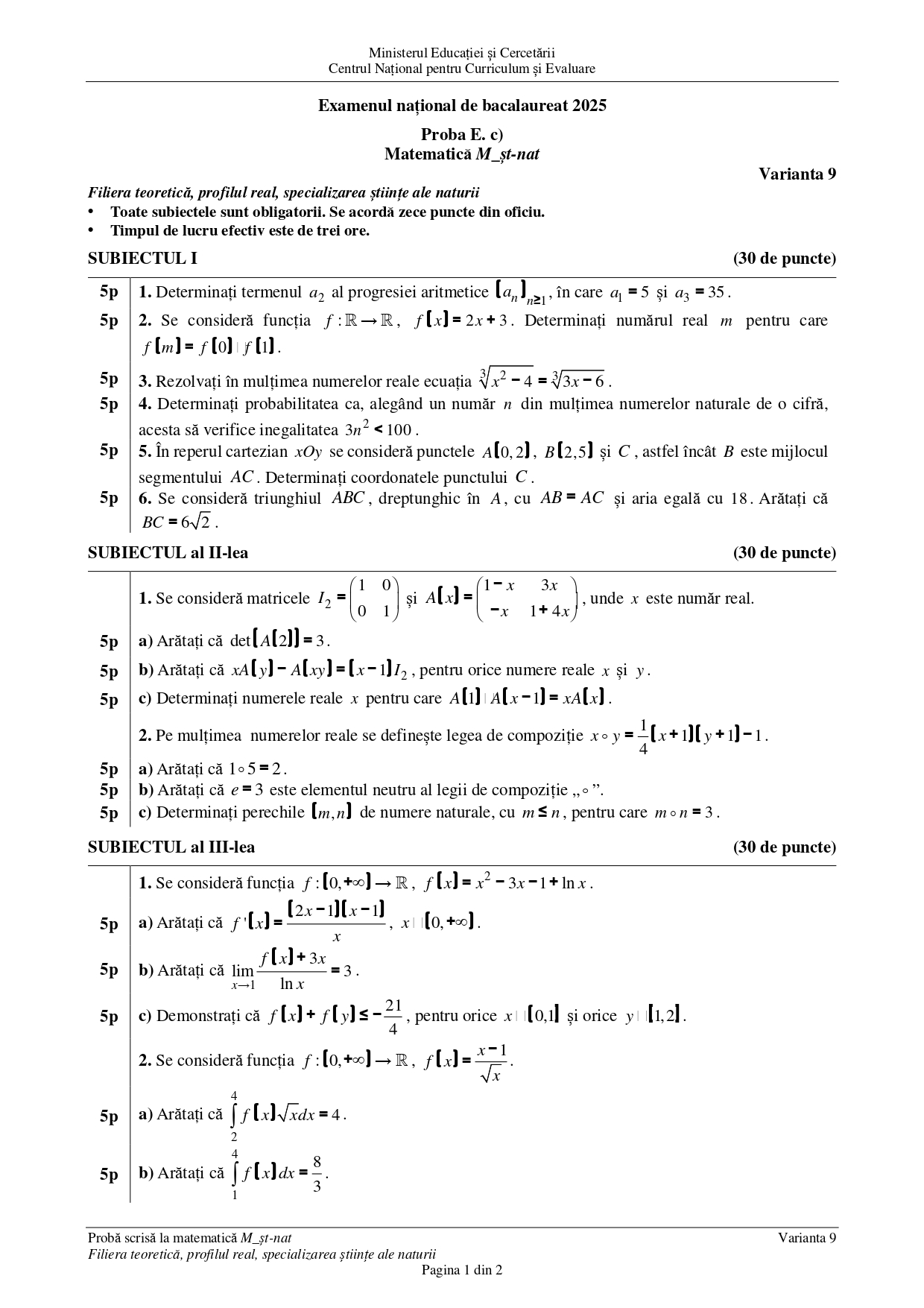 • DOCUMENT DESCARCĂ Subiect Matematică (Științe ale naturii) BAC 2025 – sesiunea august: