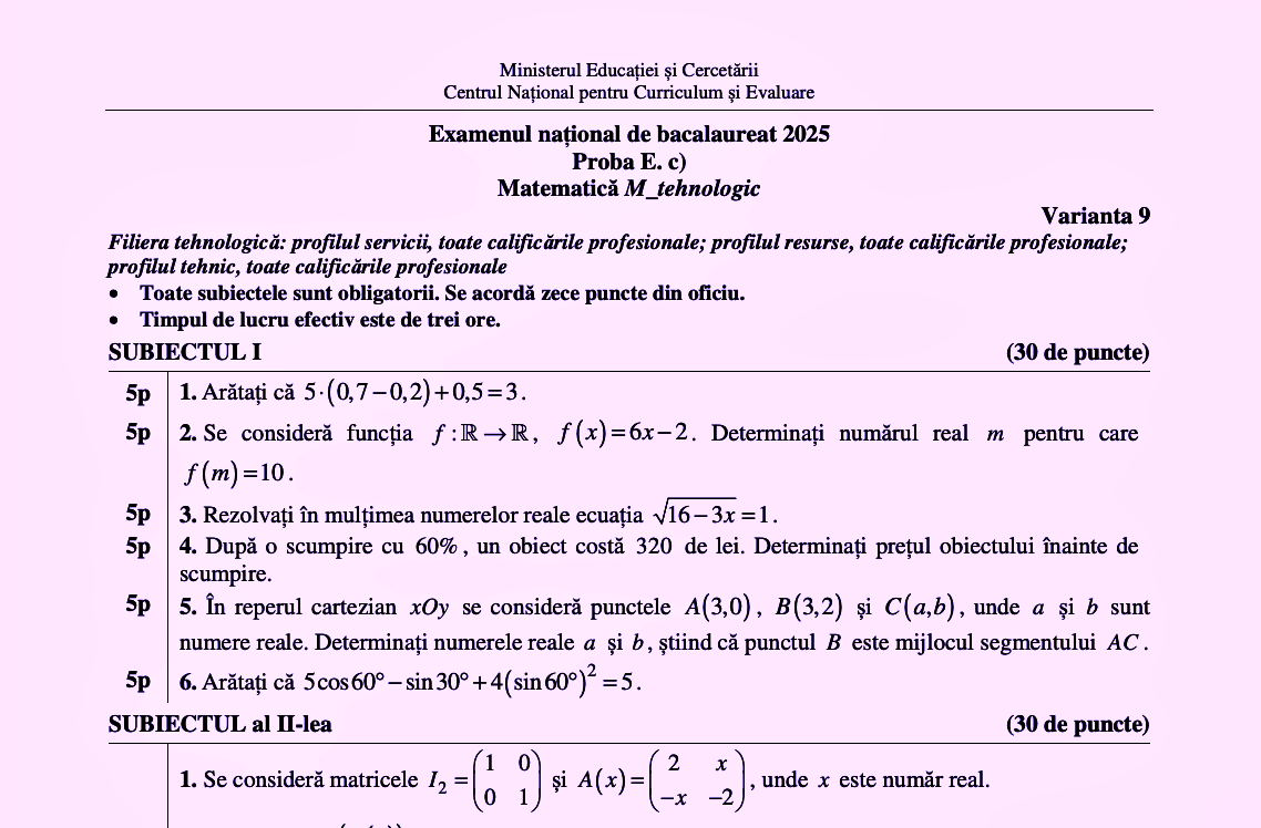 • DOCUMENT DESCARCĂ Subiect Matematică (Tehnologic) BAC 2025 – sesiunea august: