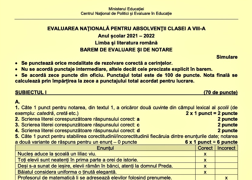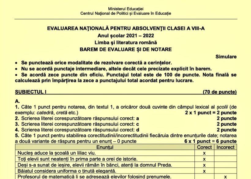 Baremele de corectare și notare pentru proba scrisă de Limba și literatura română, de la simularea Evaluării Naționale 2022, au fost publicate de ministerul Educației la ora 15:00.