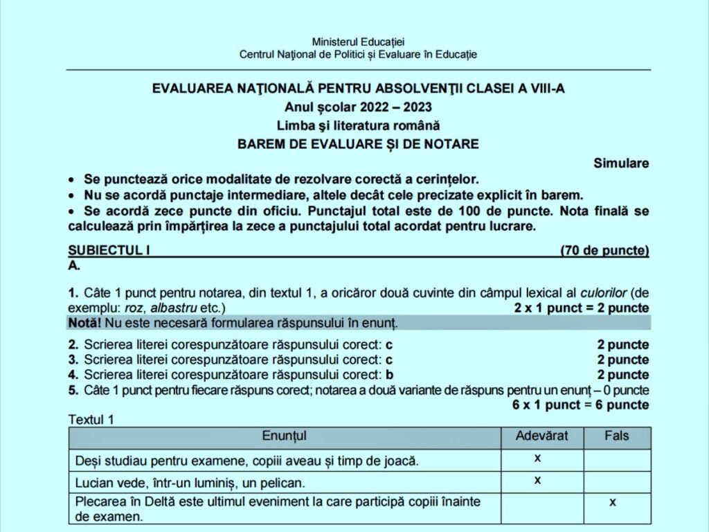 Baremele de corectare și notare pentru proba scrisă de Limba și literatura română, de la simularea Evaluării Naționale 2023, au fost publicate de Ministerul Educației la ora 15:00.