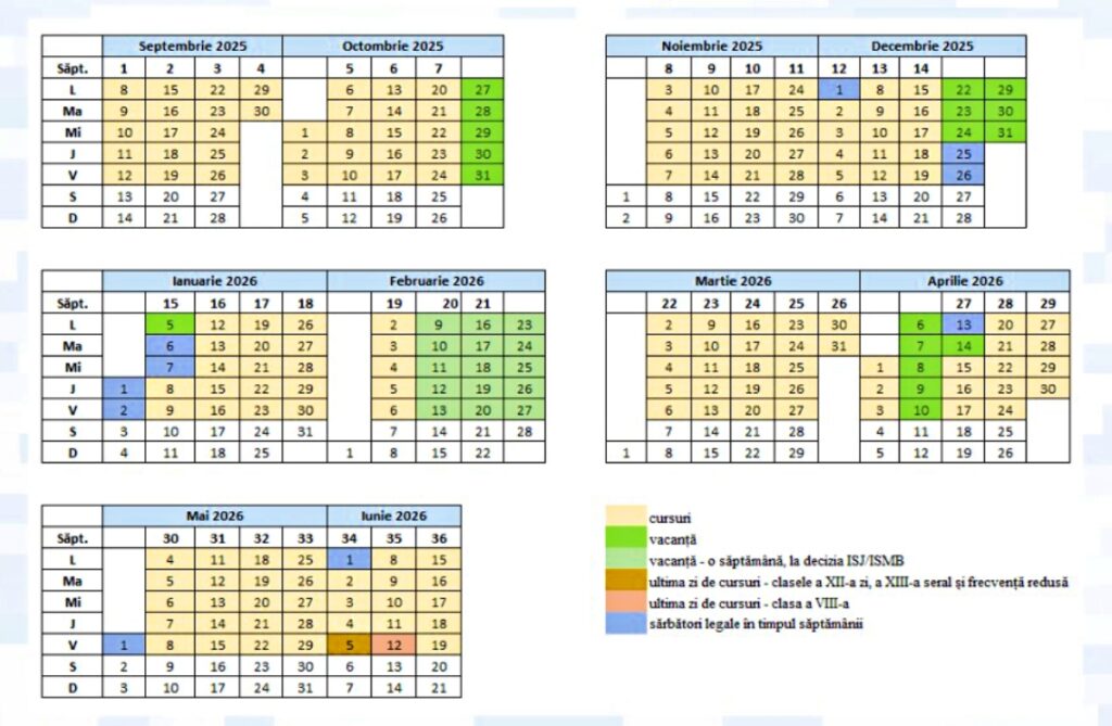 - Clasele a XII-a zi, a XIII-a seral și frecvență redusă: 34 de săptămâni, cu finalizare pe 5 iunie 2026.