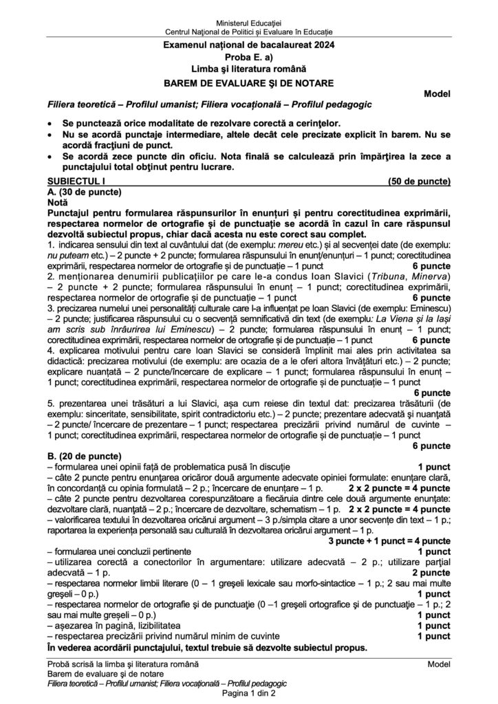 - Barem model de subiect – BAC 2024 Limba și literatura română, Real:
