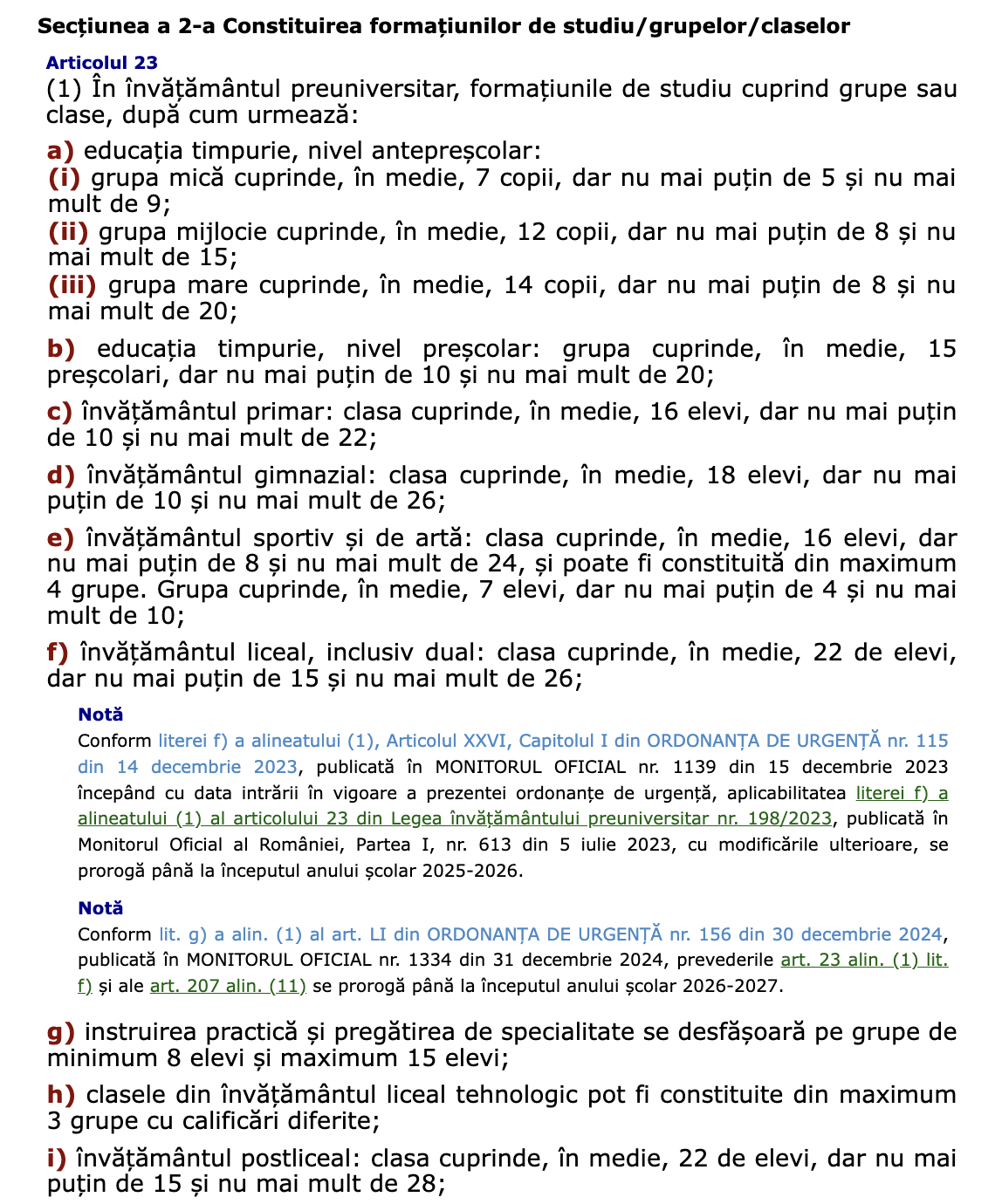 Cât despre creșterea numărului de elevi într-o clasă, legea educației 198/2023 prevede în prezent: