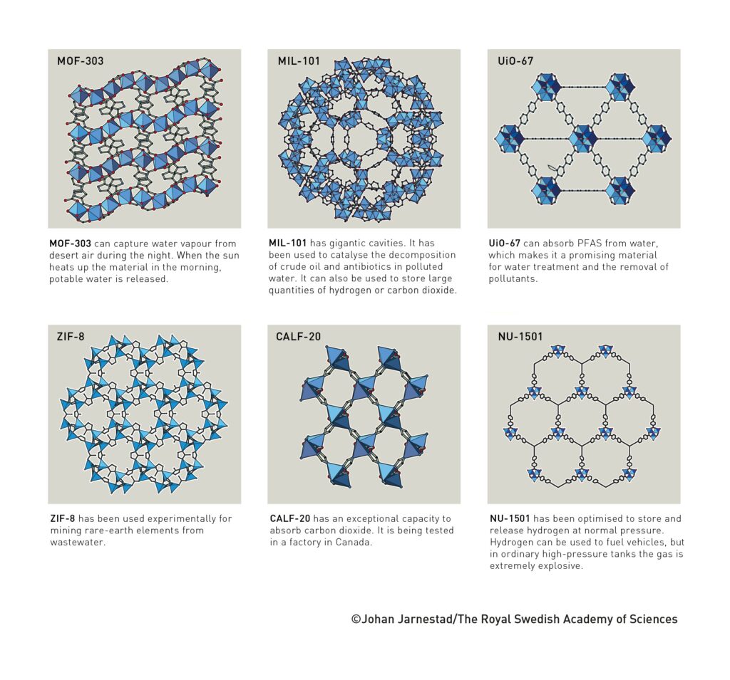 Descoperirile celor trei cercetători au lansat o ramură complet nouă în chimia materialelor. În prezent, chimiștii au creat zeci de mii de tipuri de MOF-uri, unele dintre ele având potențialul de a ajuta la rezolvarea unor provocări globale majore: separarea substanțelor PFAS din apă, descompunerea reziduurilor farmaceutice din mediu, captarea dioxidului de carbon sau colectarea apei din aerul uscat al deșerturilor.