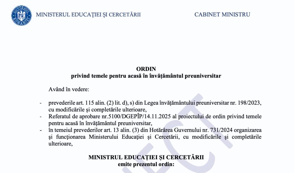 Prevederile integrale din proiectului de ordin privind temele pentru acasă în învățământul preuniversitar