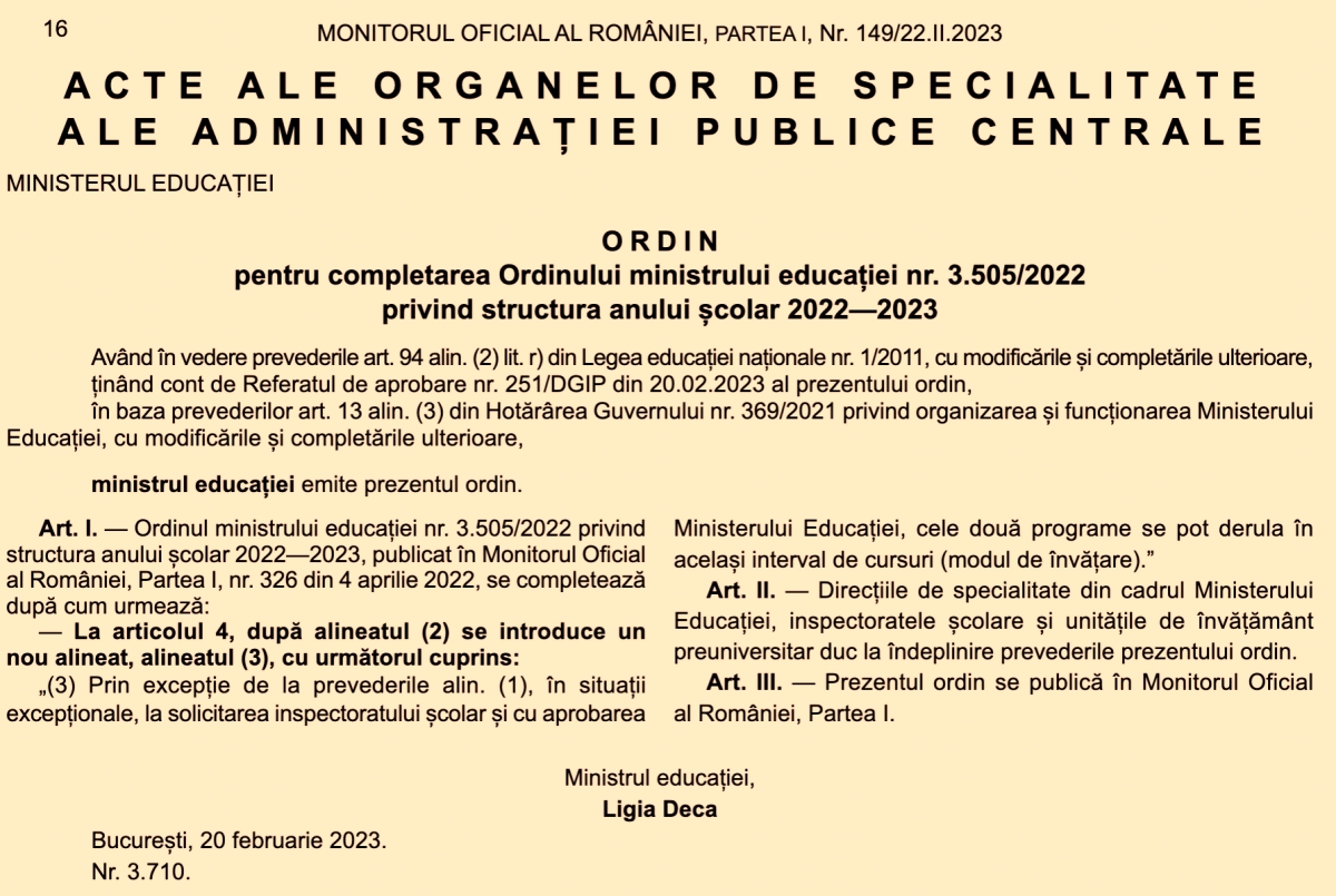 Programul „Școala altfel” și Programul „Săptămâna verde” pot fi organizate în același modul de învățare, în situații excepționale, la solicitarea inspectoratului școlar și cu aprobarea Ministerului Educației, potrivit unui ordin publicat în Monitorul Oficial. Este vorba despre ordinul nr. 3.710 din 20 februarie 2023, cel care modifică ordinul 3.505 privind structura anului scolar 2022-2023.