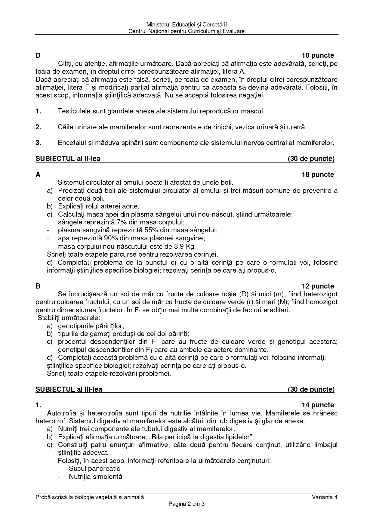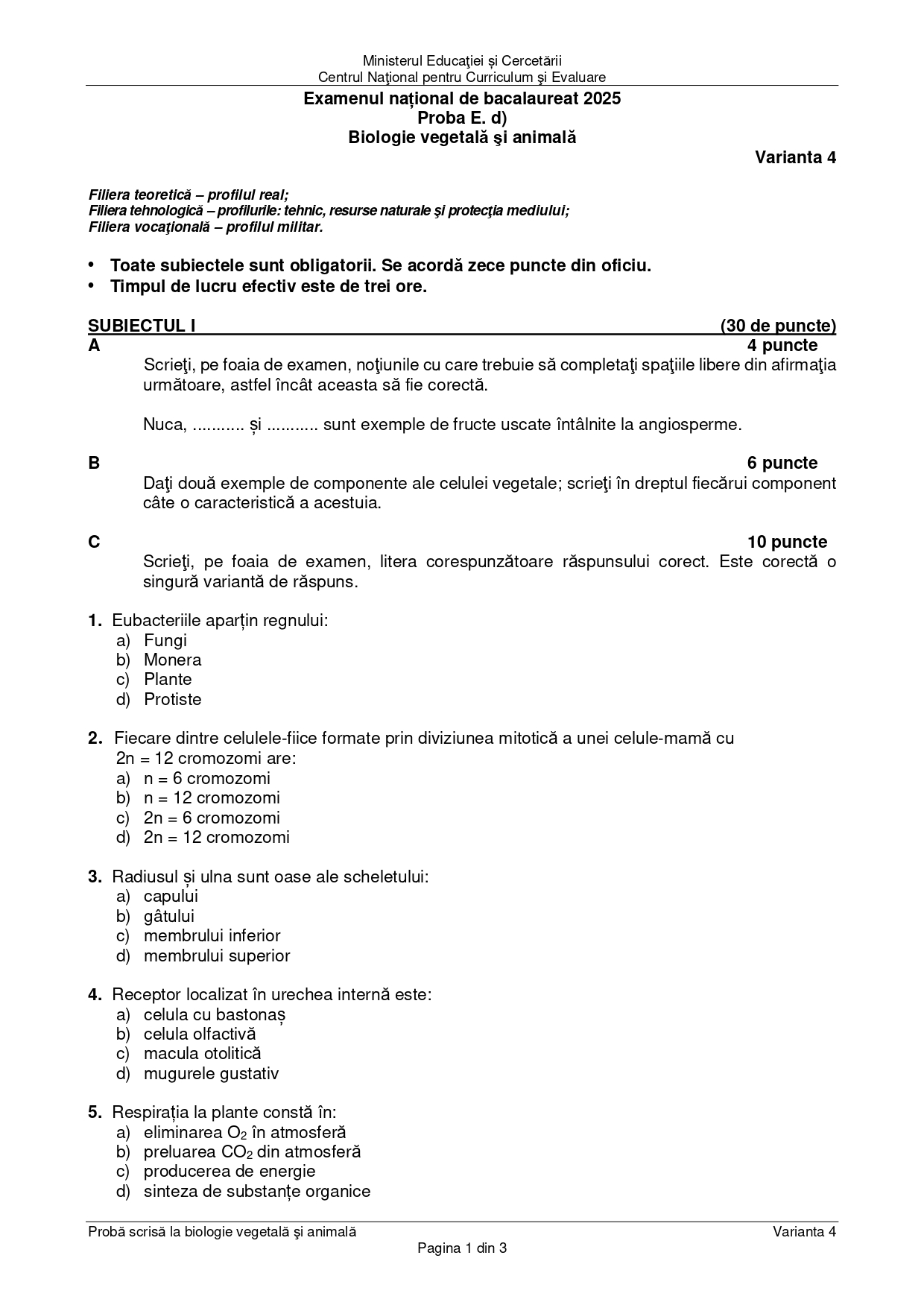 DOCUMENT DESCARCĂ Subiect Bacalaureat 2025 Toamnă – Biologie vegetală și animală: