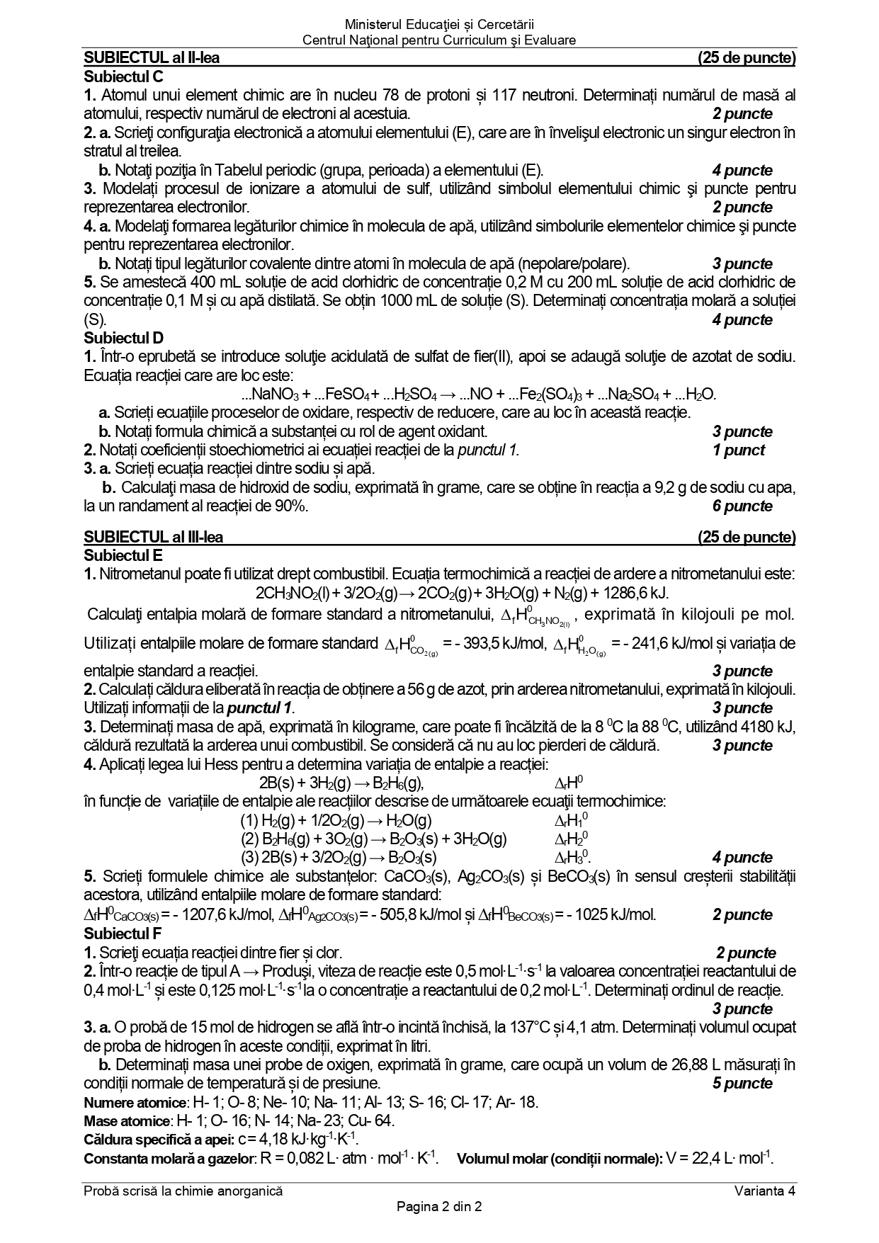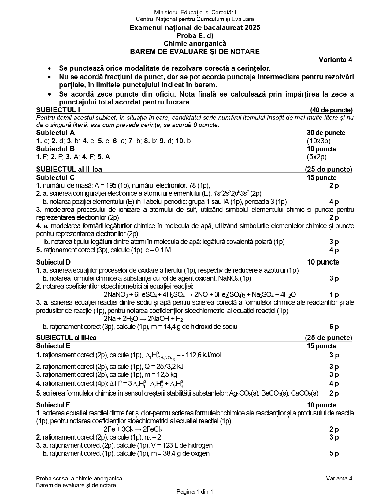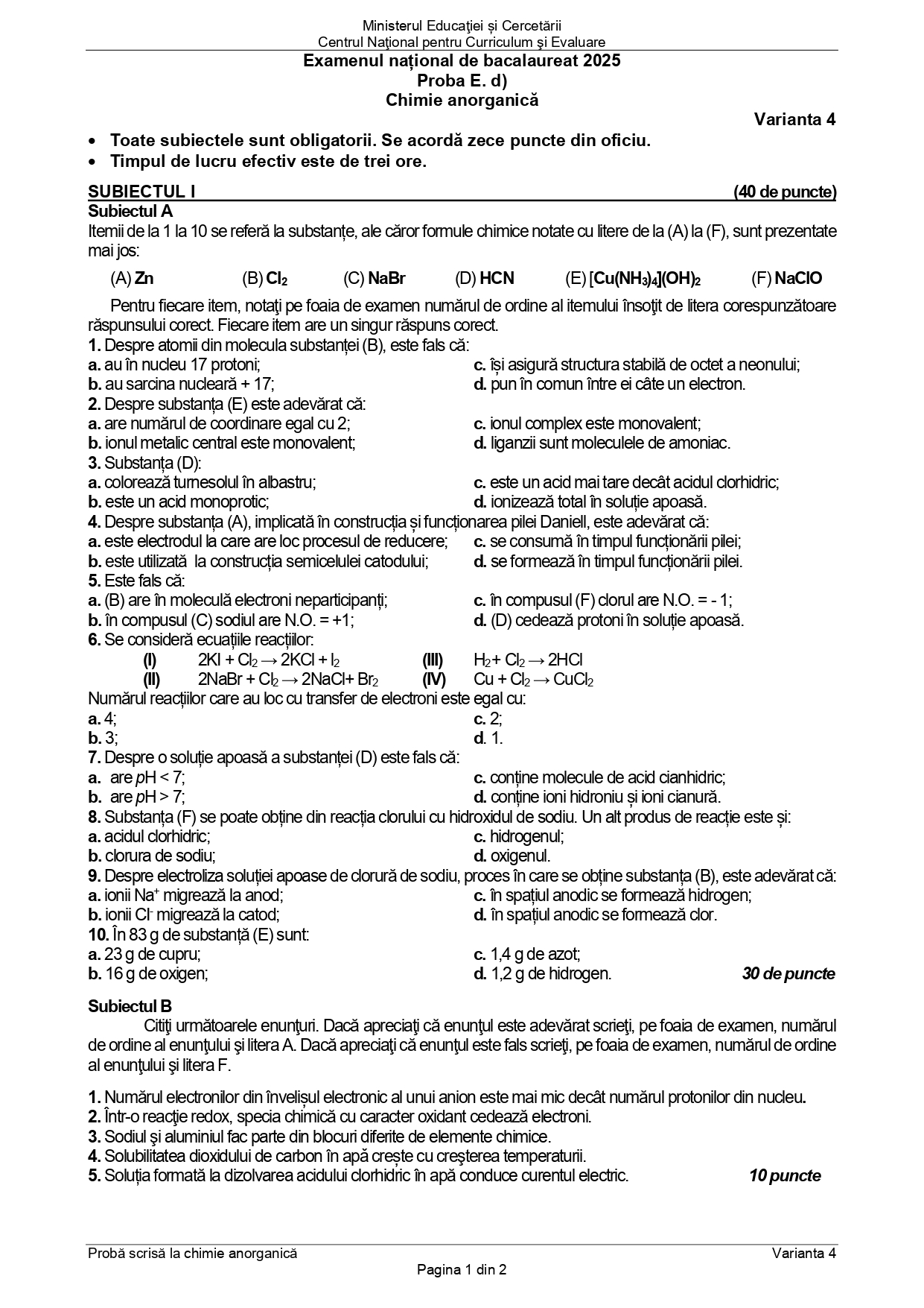 DOCUMENT DESCARCĂ Subiect Bacalaureat 2025 Toamnă – Chimie anorganică: