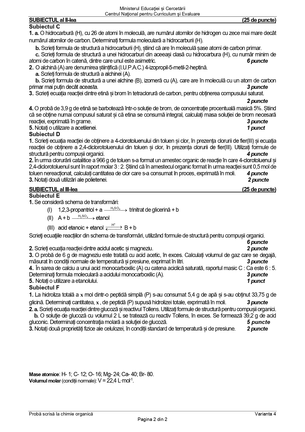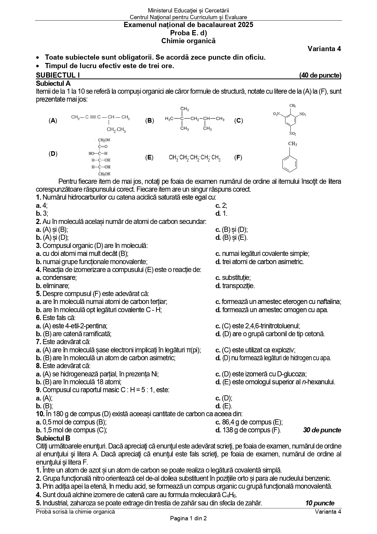 DOCUMENT DESCARCĂ Subiect Bacalaureat 2025 Toamnă – Chimie organică:
