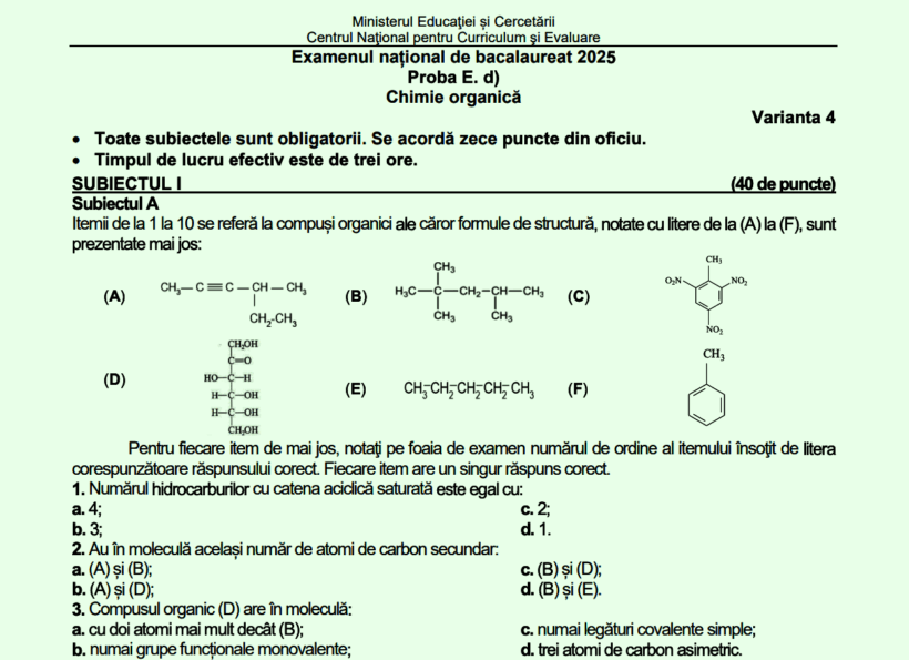 DOCUMENT DESCARCĂ Subiect Bacalaureat 2025 Toamnă – Chimie organică: