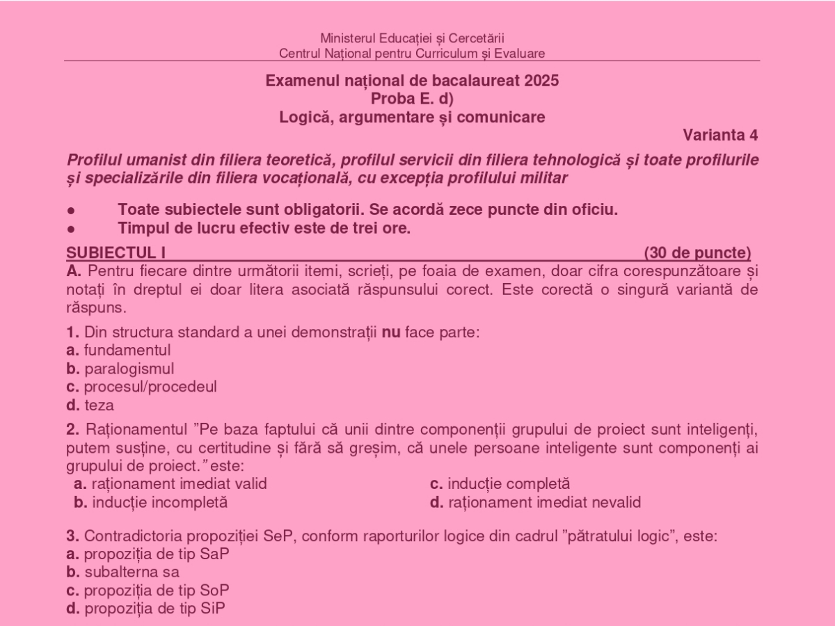 DOCUMENT DESCARCĂ Subiect Bacalaureat 2025 Toamnă – Logică și argumentare: