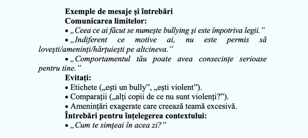 Sunt descrise tehnici distincte pentru intervievarea victimei și a agresorului, dar și metode de comunicare cu întreaga clasă, pentru a reduce riscul de stigmatizare sau repetare a actelor de violență.