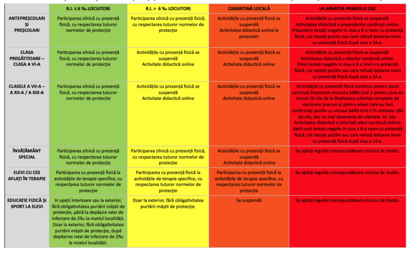 | CLASELE A VII-A – A XII-A / A XIII-A | Participarea zilnică cu prezență fizică, cu respectarea tuturor normelor de protecție | Activitățile cu prezență fizică se suspendă Activitate didactică online | Activitățile cu prezență fizică se suspendă Activitate didactică online | Activitățile cu prezență fizică continua pentru elevii vaccinați împotriva virusului SARS-CoV-2 pentru care au trecut 10 zile de la finalizarea schemei complete de vaccinare precum și pentru elevii care au fost confirmați pozitiv cu virusul SARS-CoV-2 în ultimele 180 de zile, dar nu mai devereme de ultimele 14 zile. Activitatea didactică a celorlalți elevi continuă online; dacă sunt testați negativ in ziua a 8-a revin cu prezență fizică; cei testați pozitiv sau care refuză testarea revin cu prezență fizică după ziua a 14-a. |