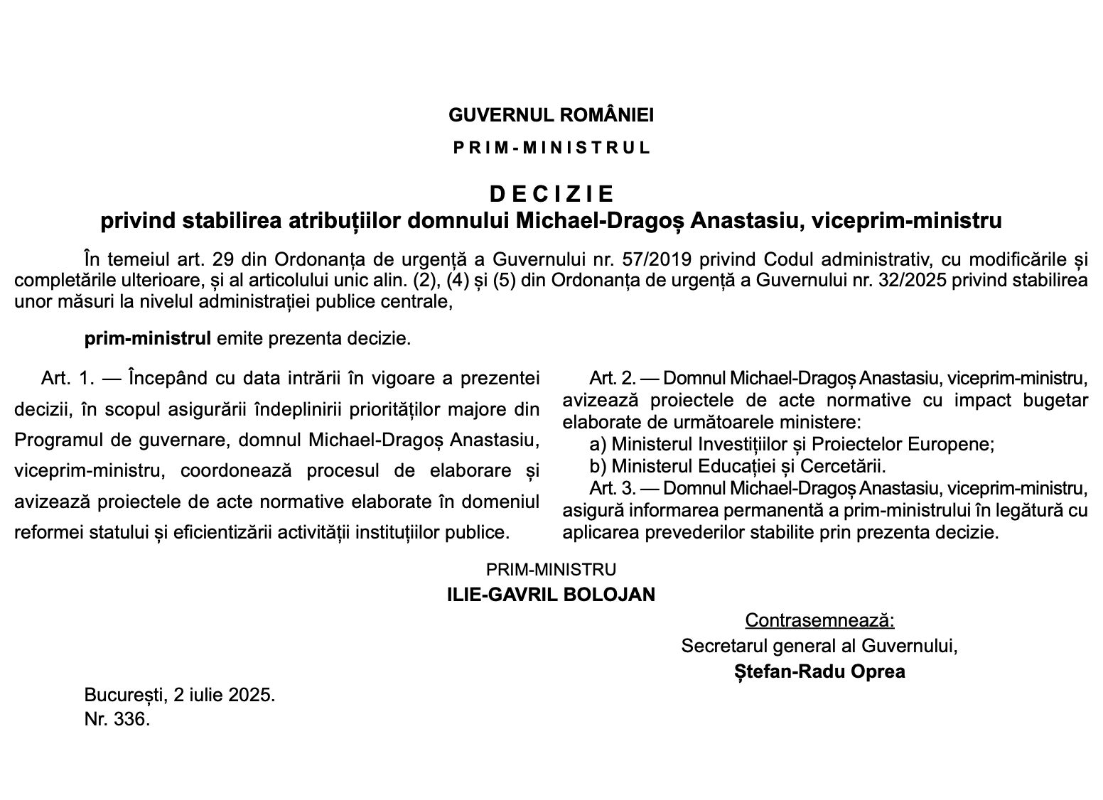 „Art. 1 – Începând cu data intrării în vigoare a prezentei decizii, în scopul asigurării îndeplinirii priorităților majore din Programul de guvernare, domnul Michael-Dragoș Anastasiu, viceprim-ministru, coordonează procesul de elaborare și avizează proiectele de acte normative elaborate în domeniul reformei statului și eficientizării activității instituțiilor publice”, scrie în decizie.