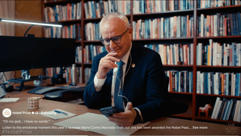 Momentul emoționant în care Maria Corina Machado, lidera opoziției democratice din Venezuela, a fost anunțată prin telefon, de directorul Institutului Norvegian pentru premiile Nobel, că a câștigat premiul Nobel pentru Pace 2025, a fost surprins video și postat pe pagina de Facebook a premiilor Nobel, vineri, 10 octombrie, la scurt timp după anunțul oficial. „Oh, Doamne! Nu am cuvinte. Eu sunt doar o persoană, sigur nu merit premiul”, a spus ea.