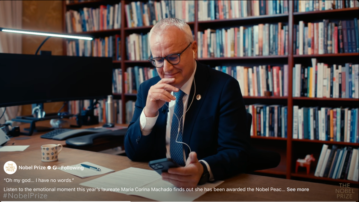 Momentul are loc cu 5 minute înainte de anunțul oficial și suprinde nu doar emoția laureatei Mariei Corina Machado, ci și emoția directorului Institutului Norvegian.