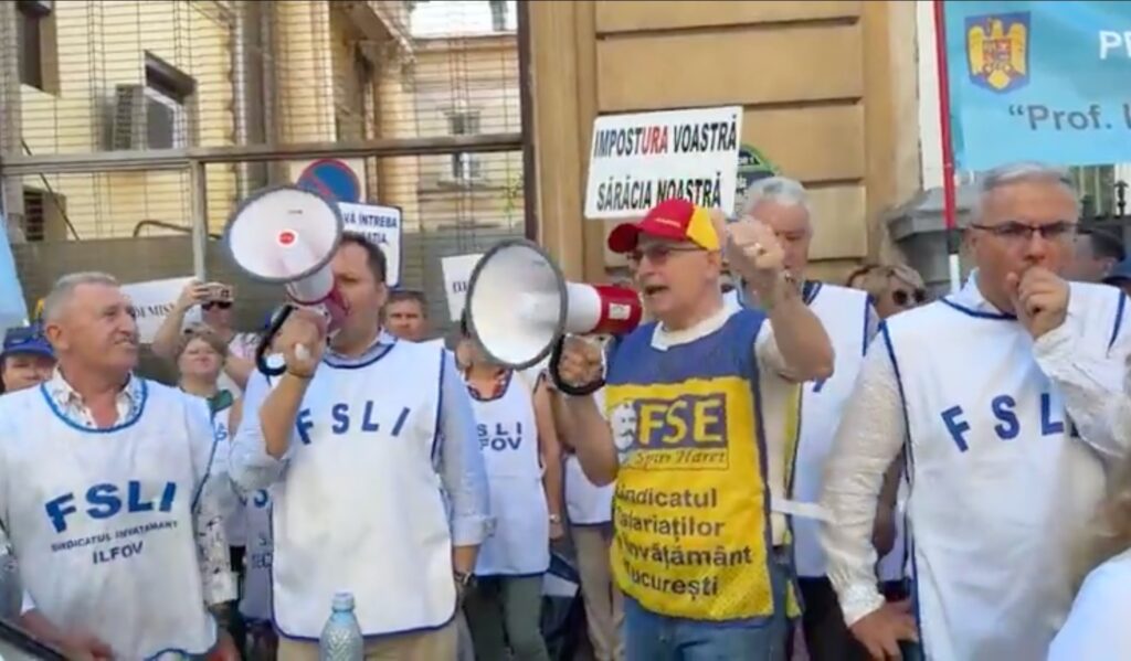 Reprezentanții principalelor federații sindicale s-au adunat luni dimineață, pentru a a patra zi, în fața sediului MinisteruluI Educației și Cercetării, pentru proteste față de Legea Bolojan, ce include măsuri precum creșterea normei didactice. Manifestanții scandează „Demisia” și „Jos cenzura” și mulți dintre ei poartă marcaje ale unor organizații județene din țară, inclusiv din Suceava sau Mehedinți.